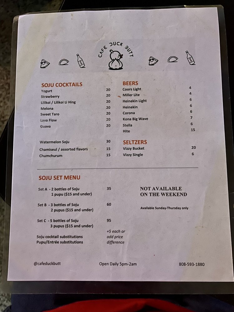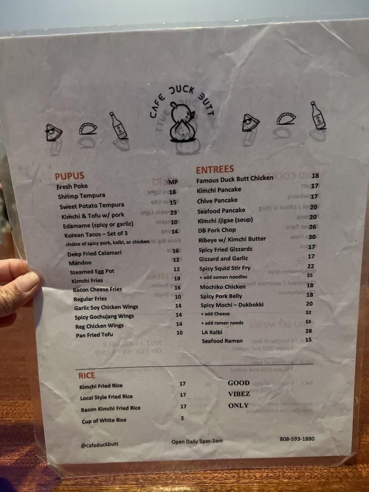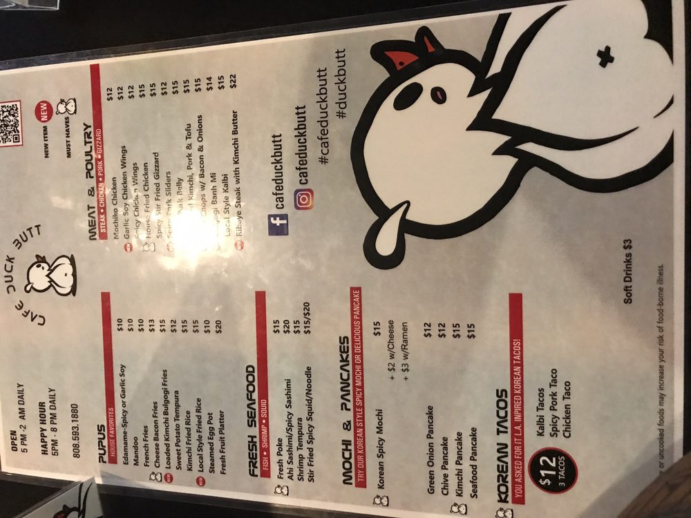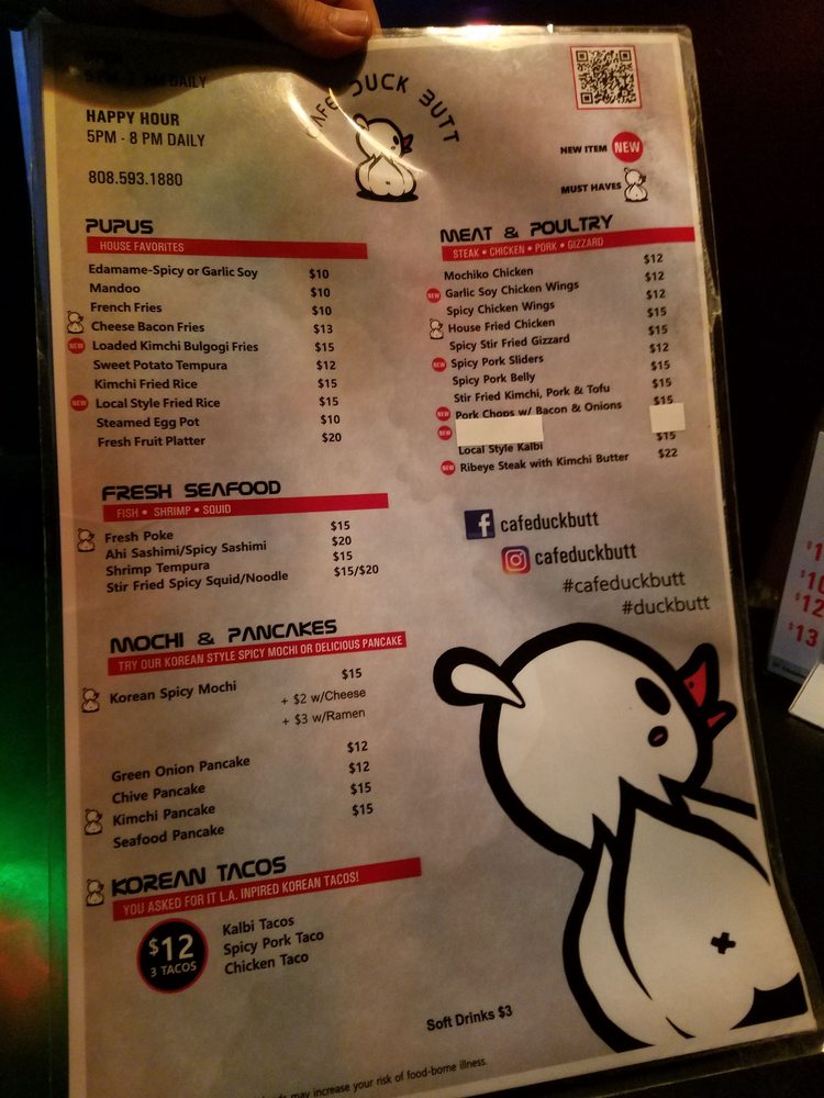 Introducing the menu at Café Duck Butt, a lively Korean bar in Honolulu, HI, offering a variety of options for a fun night out. From fresh seafood like Ahi Sashimi and Poke to flavorful pupus like Garlic Soy Edamame and Spicy Edamame, there is something for everyone. Don't miss out on the delicious Korean tacos, including Kalbi and Spicy Pork varieties. The restaurant also features karaoke, perfect for entertaining groups on Thursday, Friday, and Saturday nights. Customers rave about the friendly service, refreshing drinks like watermelon and lava flow soju, and the laid-back vibe of the establishment. Whether you're looking to laugh, sing, or simply enjoy great food and drinks with friends, Café Duck Butt is the place to be. Experience the fun and tasty offerings of this unique spot for a memorable night out.