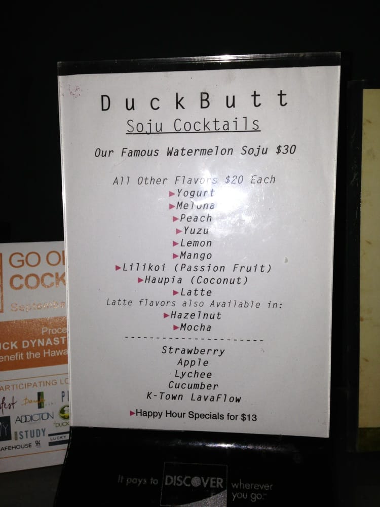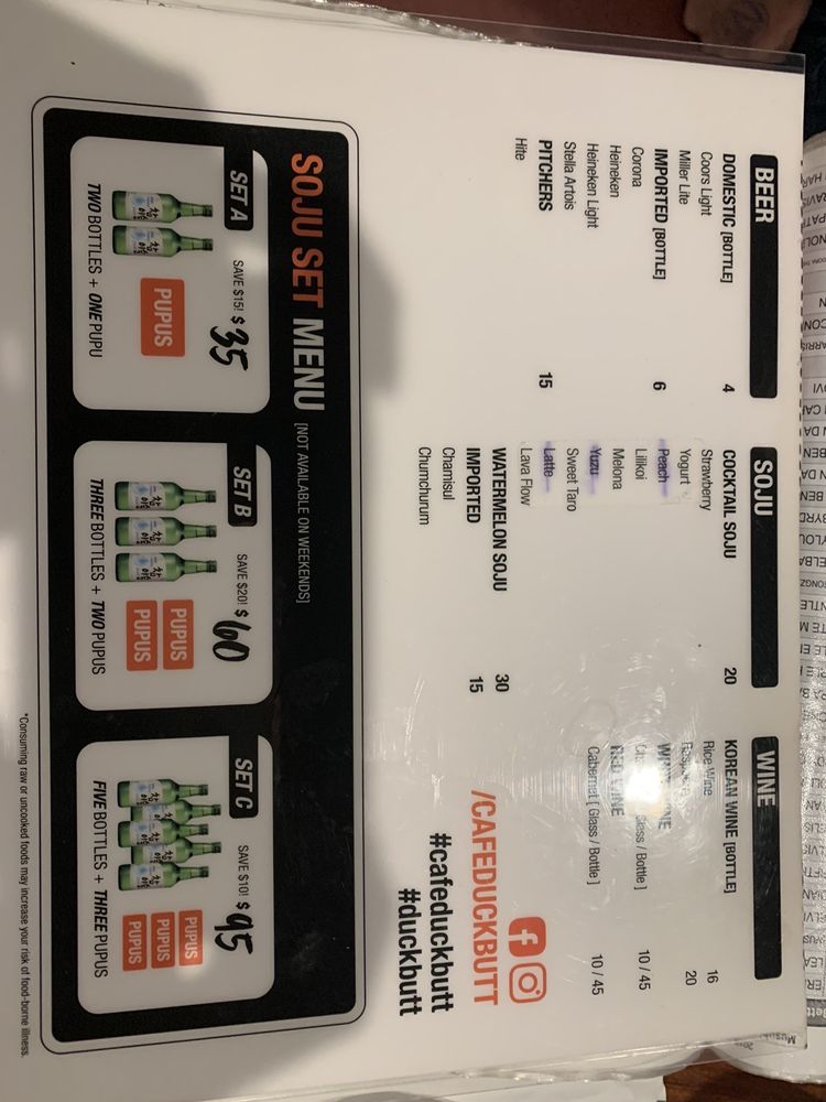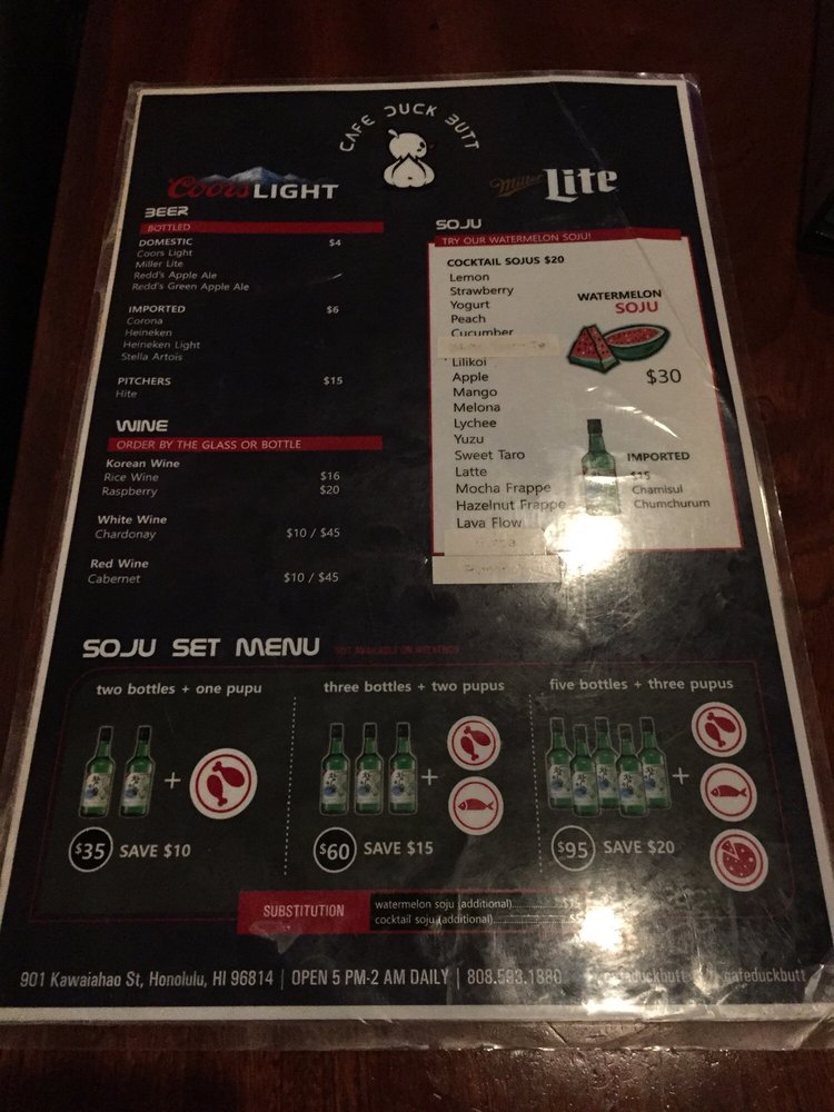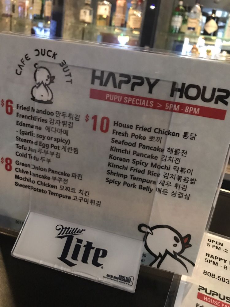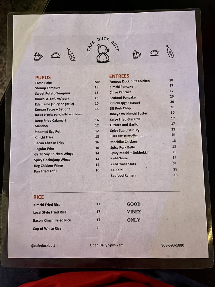 Introducing the menu at Café Duck Butt, a lively Korean bar in Honolulu, HI, offering a variety of options for a fun night out. From fresh seafood like Ahi Sashimi and Poke to flavorful pupus like Garlic Soy Edamame and Spicy Edamame, there is something for everyone. Don't miss out on the delicious Korean tacos, including Kalbi and Spicy Pork varieties. The restaurant also features karaoke, perfect for entertaining groups on Thursday, Friday, and Saturday nights. Customers rave about the friendly service, refreshing drinks like watermelon and lava flow soju, and the laid-back vibe of the establishment. Whether you're looking to laugh, sing, or simply enjoy great food and drinks with friends, Café Duck Butt is the place to be. Experience the fun and tasty offerings of this unique spot for a memorable night out.